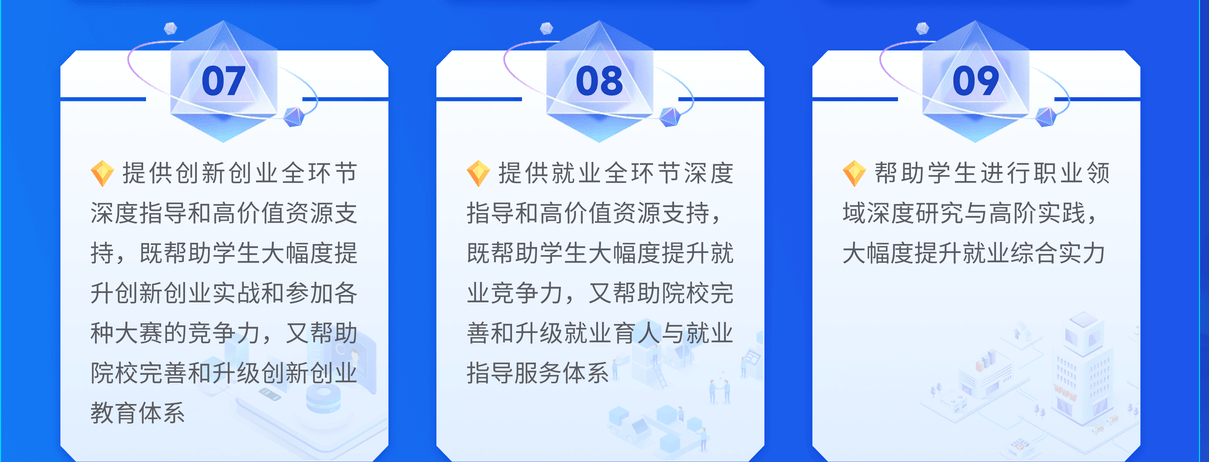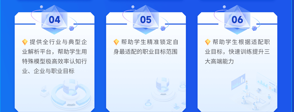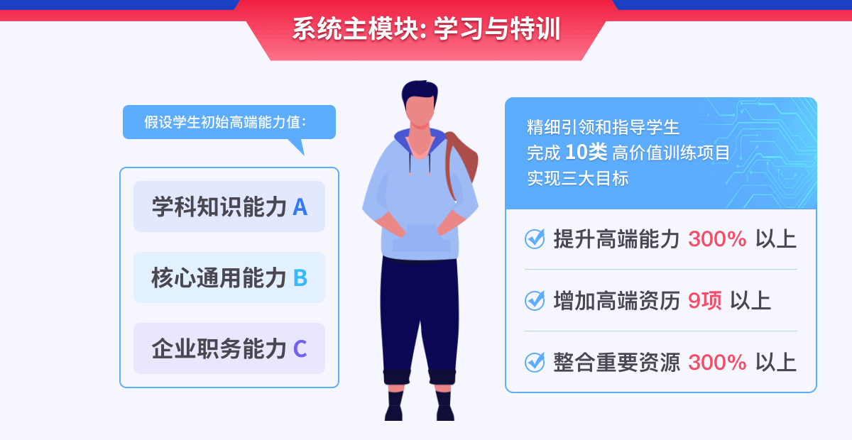 根据对超过1277家全行业龙头企业、典型事业单位和政府机构的深层研究。一切社会组织对大学生的价值判断,主要决定于三类高端能力体系的综合强度,对大学生的招录选拔都是针对三类高端能力所细分的18个指标进行测评判断。只是不同类型机构在18个细分指标的评分权重有所不同